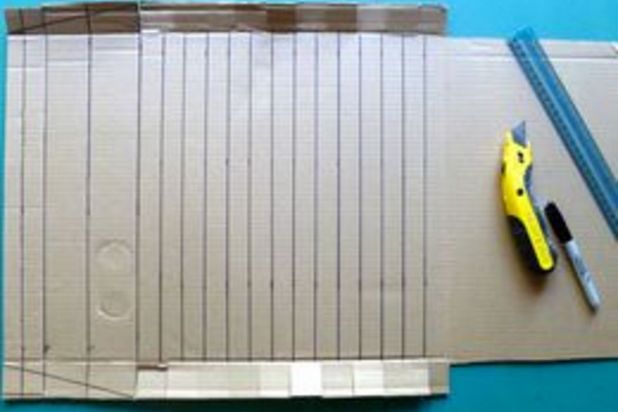 You will have one more end piece to use to make the hood. Cut off seven inches from the top flap and then measure, mark, and finally score at intervals of : ½ inch, 1 ½ inches, 4 ¼ inches, and 6 ¼ inches down. Then make vertical scores in one inch intervals along the rest of the end piece, but leave the end flap whole. Create a horizontal score down along every side of the end flap and end piece, an inch away from the edge. Next cut through so you reach these horizontal score lines at every vertical score. Finally cut an inch score line off of each side of your end flap.