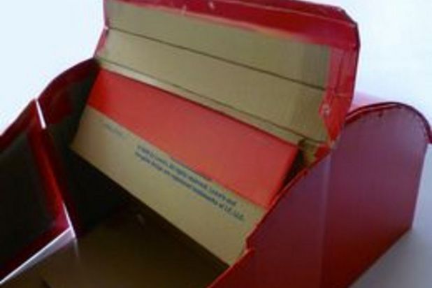 Mark the point on the larger cardboard box that is six inches from the top edge along the wide side. Then draw a curve going from this mark down to the lower edge in front. Cut out following this line, but only go through one layer of the cardboard. You can then use this piece of cardboard as a guide to repeat the process, cutting the same exact curve on the box’s opposite side.